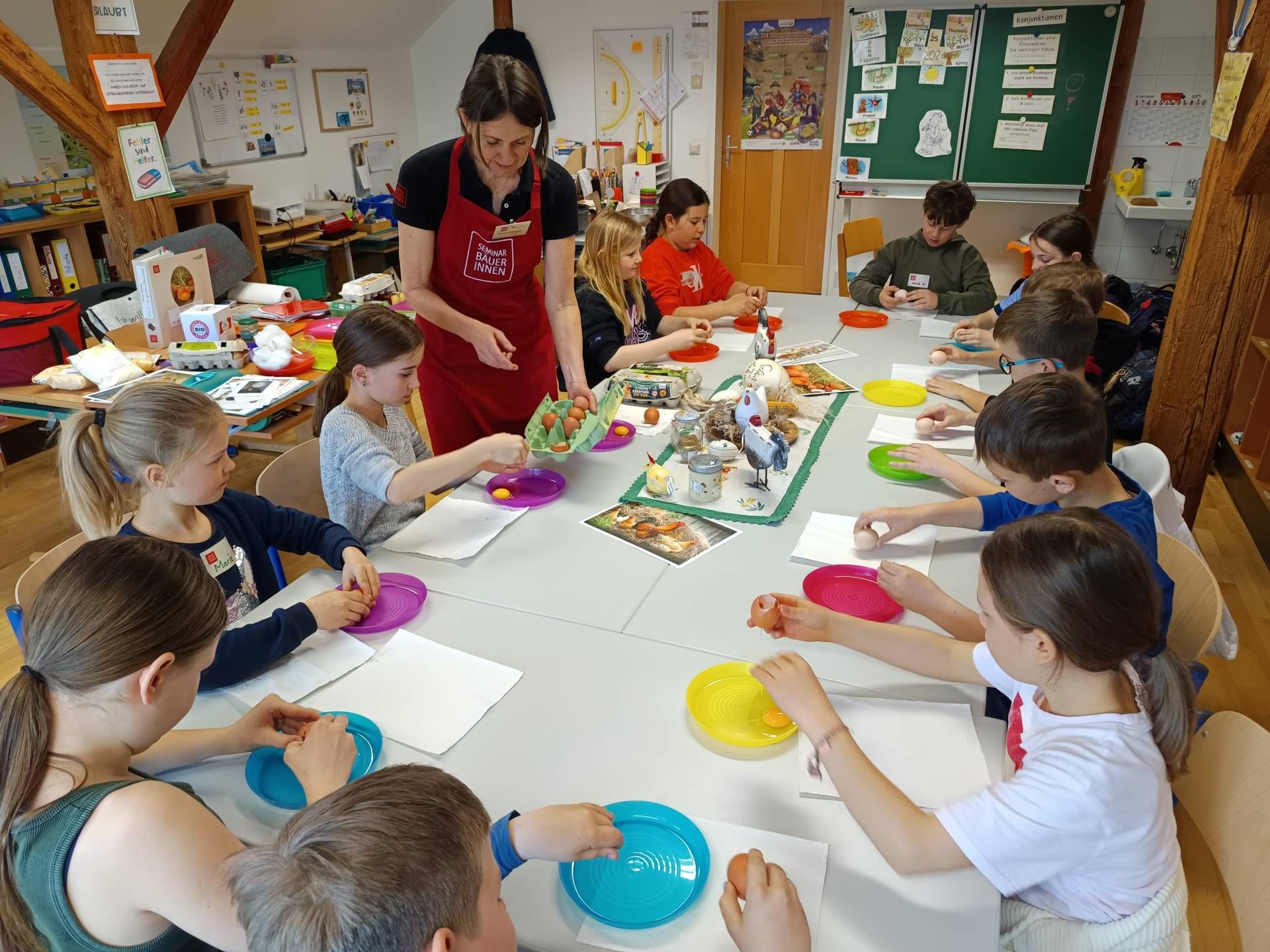 Am 25. April durften wir an der Volksschule Lieserhofen besonderen Besuch begrüßen: Die Seminarbäuerinnen waren bei uns zu Gast und brachten den Kindern Wissenswertes rund um das Ei und die Hühnerhaltung näher. Mit viel Anschauungsmaterial und kindgerechten Erklärungen erfuhren die Schülerinnen und Schüler, wie Hühner gehalten werden und worauf es dabei ankommt. Besonders interessant war die Kennzeichnung auf Eiern nach der ÖNORM: Die Kinder lernten, was die Zahlen und Buchstaben auf dem Ei bedeuten und wie man erkennen kann, aus welcher Haltungsform ein Ei stammt. Ein weiteres Highlight war das Kennenlernen verschiedener Hühnerrassen. Die Kinder staunten über die Vielfalt und erfuhren, dass nicht jedes Huhn gleich aussieht oder die gleichen Eier legt. Auch die Belastbarkeit von Eierschalen wurde ausprobiert: Mit kleinen Experimenten konnten die Kinder selbst entdecken, wie stabil ein Ei eigentlich ist – das sorgte für große Überraschung und Begeisterung! Natürlich durfte auch die praktische Umsetzung nicht fehlen. Gemeinsam wurde eine köstliche Eierspeise zubereitet. Mit viel Freude schnitten die Kinder selbst frische Karotten, Paprika und Schnittlauch, die anschließend als gesundes Topping verwendet wurden. Der Besuch der Seminarbäuerinnen war für alle ein lehrreicher und abwechslungsreicher Vormittag, bei dem die Kinder nicht nur viel Neues gelernt, sondern auch mit allen Sinnen erlebt haben. Ein herzliches Dankeschön für diesen spannenden Einblick in die Welt der Hühner und Eier!