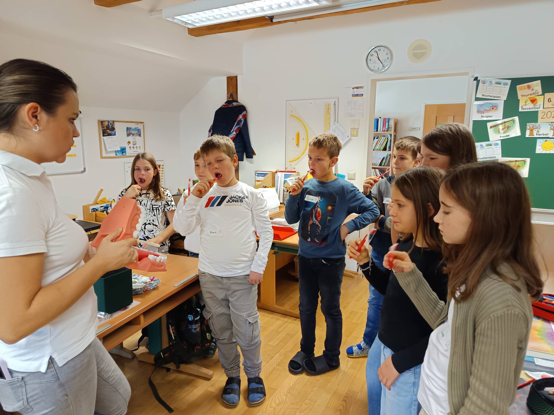 Auch heuer besuchte die Zahngesundheitsexpertin wieder die 4. Klasse und gab wertvolle Tipps zum Thema „Gesunde Zähne – wir schaffen das!“. Nachdem die Kinder über den Aufbau der Zähne, viel über gesunde Ernährung und Vermeidung von zu viel Zucker in Lebensmitteln erfahren hatten, wurde das richtige Zähneputzen mit der KAI – Methode wiederholt und auch praktisch durchgeführt. Als Zusammenfassung der lehrreichen Unterrichtseinheiten gestalteten die Schülerinnen und Schüler noch gemeinsam Plakate, die zu einem späteren Zeitpunkt auch noch der Klasse präsentiert wurden.